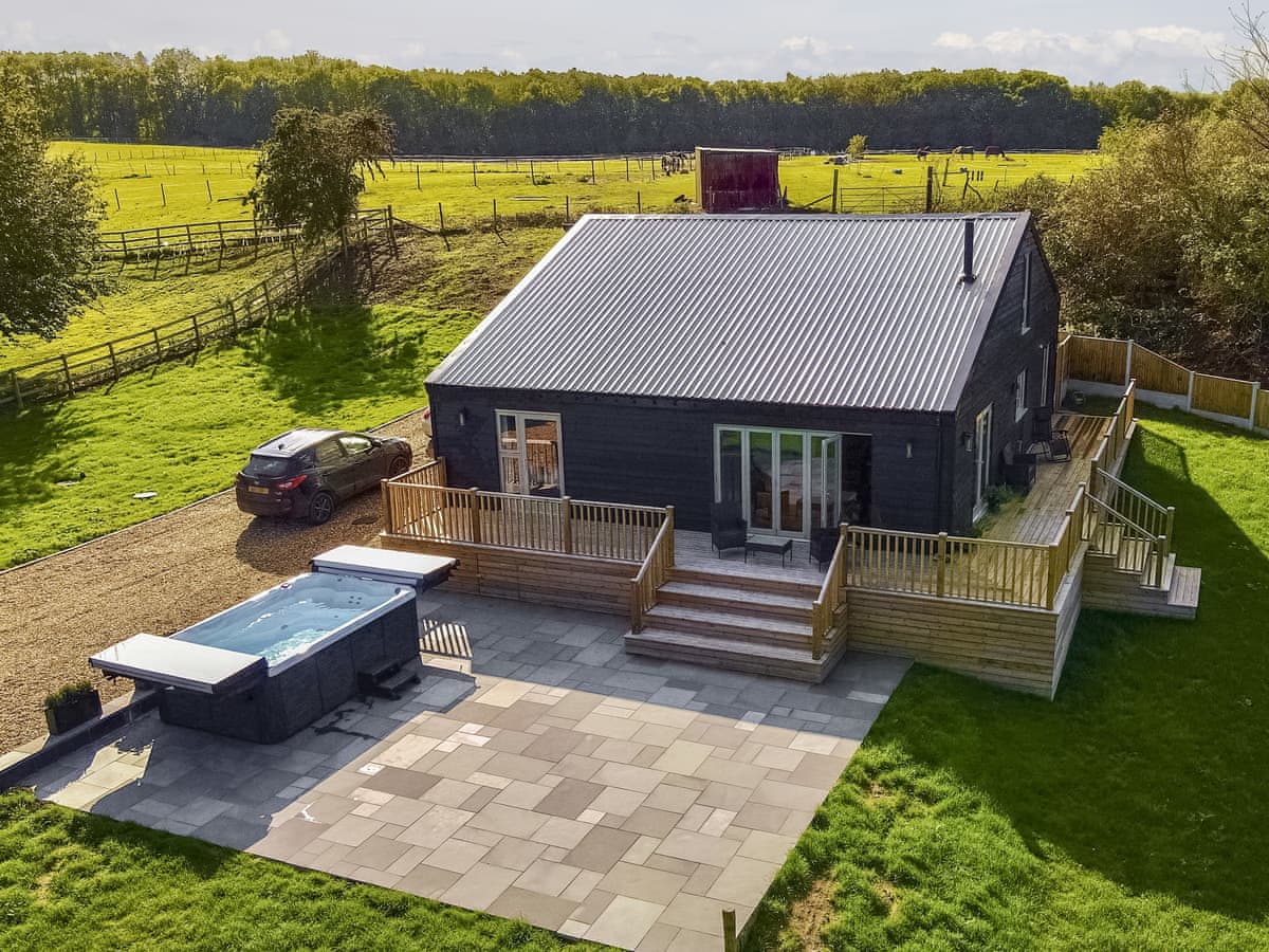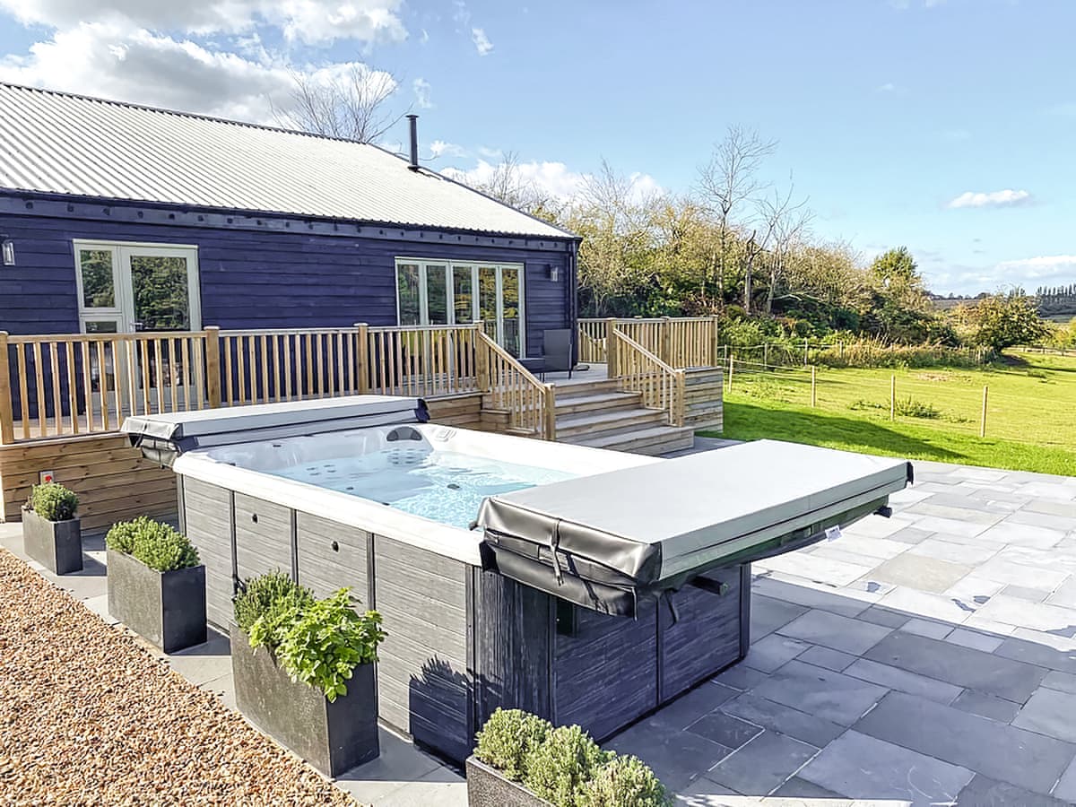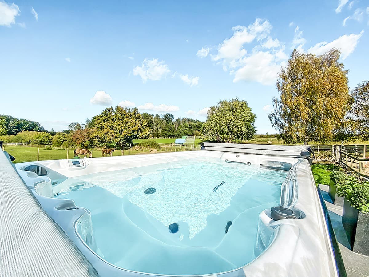Outside, the raised decked terrace wraps around the barn, offering stunning views across the fields. Steps lead down to a spacious patio with an al fresco dining area and a luxurious swim spa with hot tub section (available 8am–9pm), ideal for relaxing after a day of exploring. Bathrobes are provided so you can wrap up warm and enjoy a drink under the stars. Guests are kindly asked to keep noise to a minimum after 10pm to respect the peaceful surroundings.