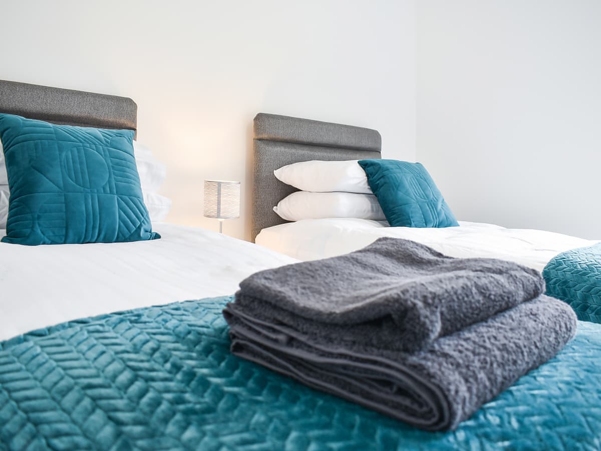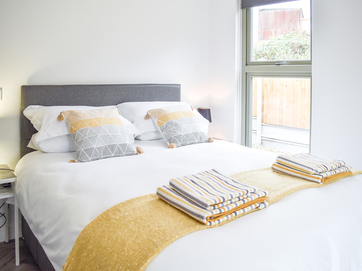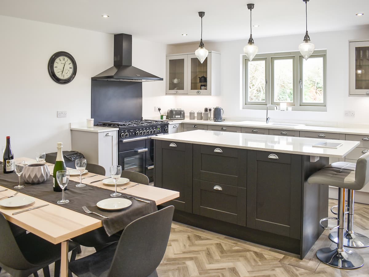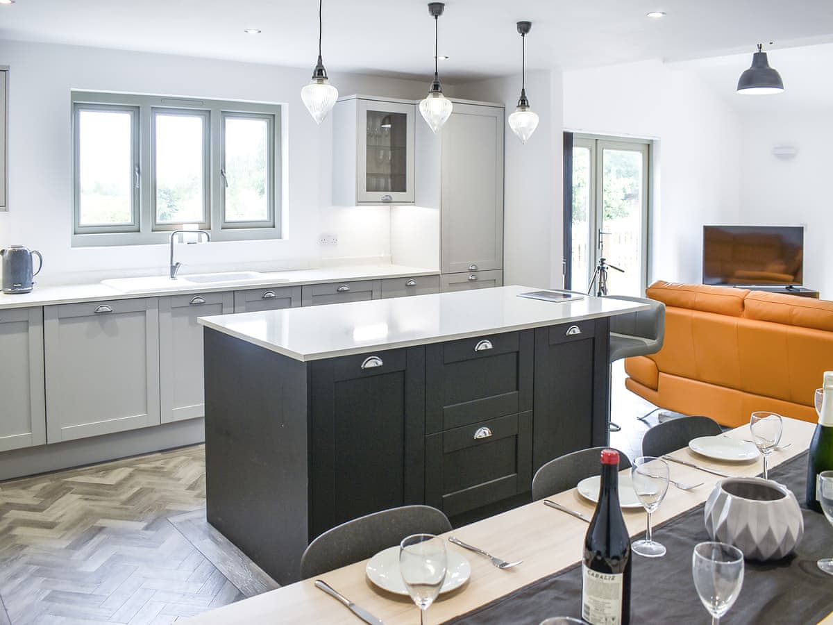 The open-plan living area is designed for socialising, with a fully equipped kitchen perfect for family meals or a champagne afternoon tea (available to order from the owner’s nearby catering business). The adjoining lounge, with its roaring wood burner, offers a cosy spot to unwind with a glass of wine and a classic film, while bi-fold doors flood the space with natural light and bring the outdoors in.