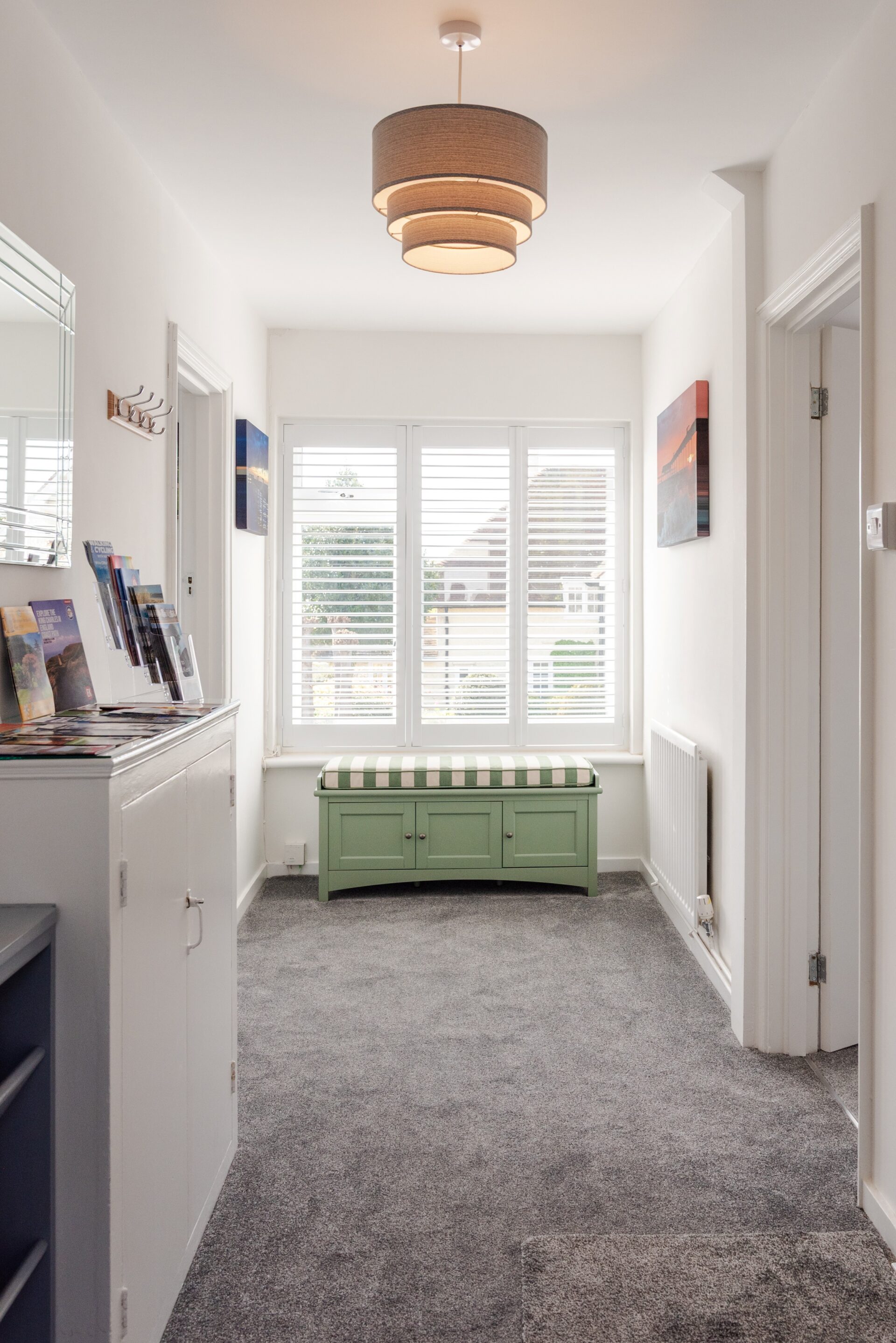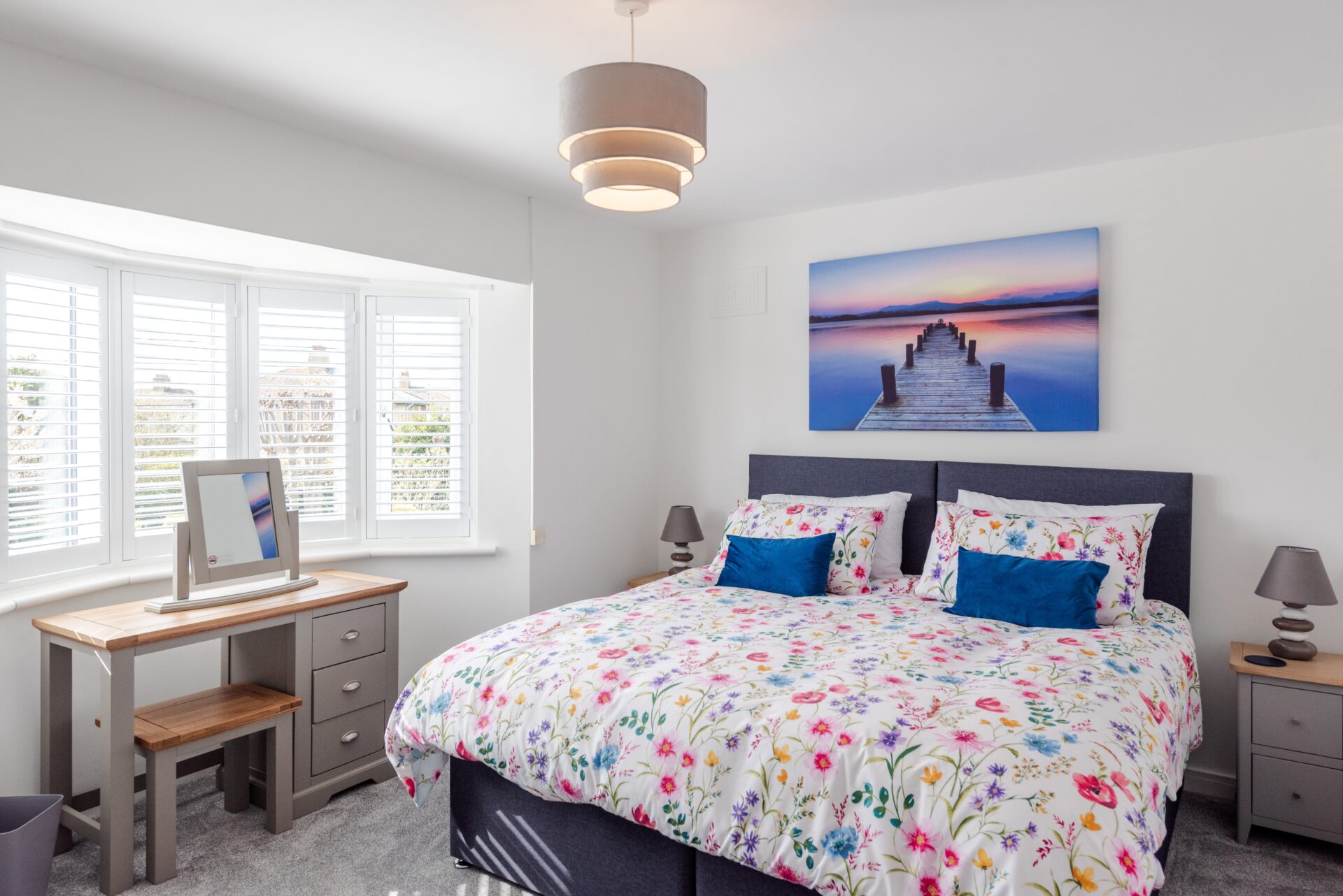 There is separate access to this first floor apartment and on entering there is a spacious landing with a double (or twin if you prefer) bedroom leading off. Colonial shutters allow lots of light and gives the room a lovely fresh feel.